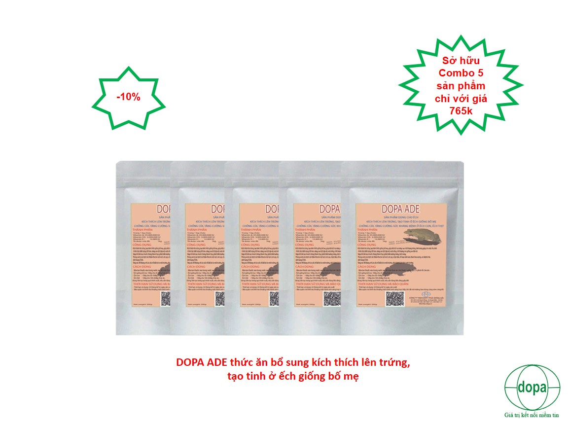 DOPA ADE thức ăn bổ sung kích thích lên trứng, tạo tinh ở ếch giống bố mẹ, giúp ếch bố mẹ nâng cao chất lượng trứng, tinh trùng giúp cho việc thụ tinh ở ếch đạt chất lượng tốt hơn, nâng cao tỷ lệ ấp nở, nuôi sống, chất lượng con giống sau khi nở.