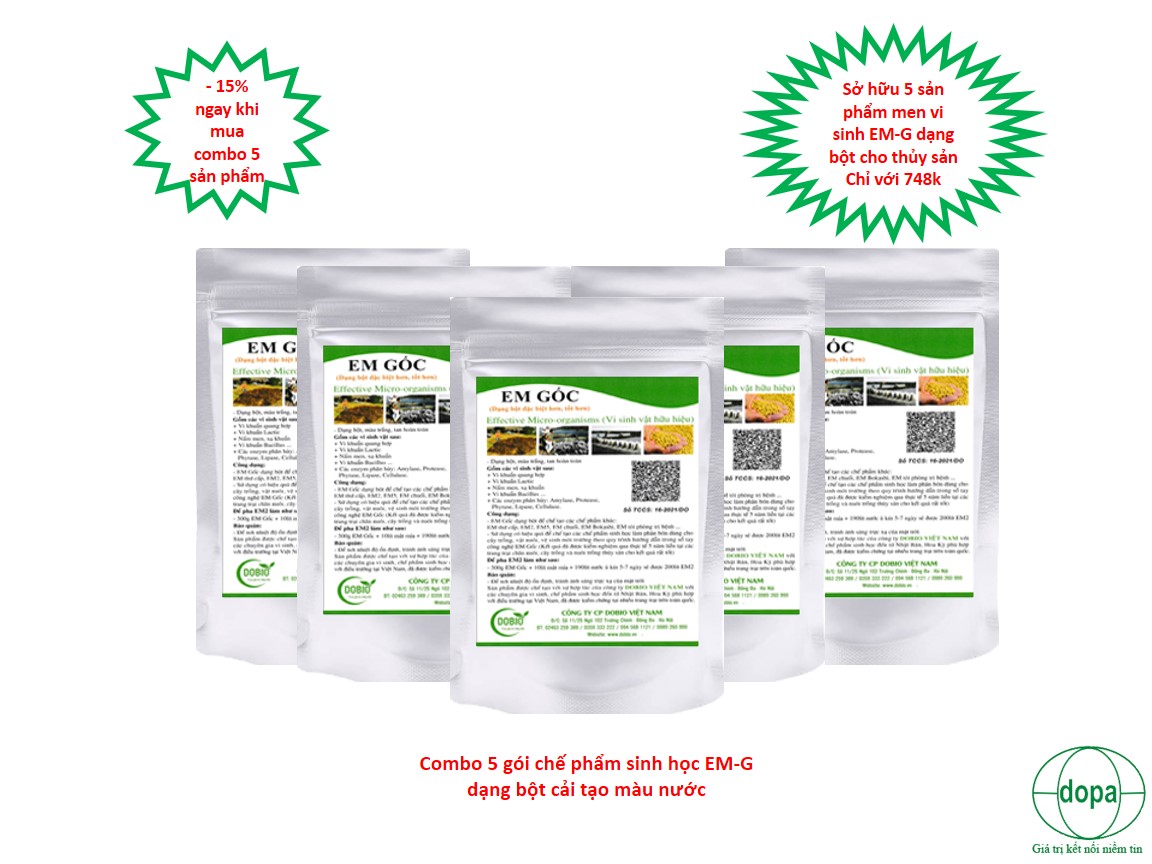 EM G gốc dạng bột - sản phẩm không thể thiếu trong nuôi trồng thủy sản, chăn nuôi gia súc, gia cầm và trồng trọt. Để mua được sản phẩm chất lượng, chính hãng mời quý bà con liên hệ trực tiếp với Thủy sản Dopa để được tư vấn và hỗ trợ tốt nhất!