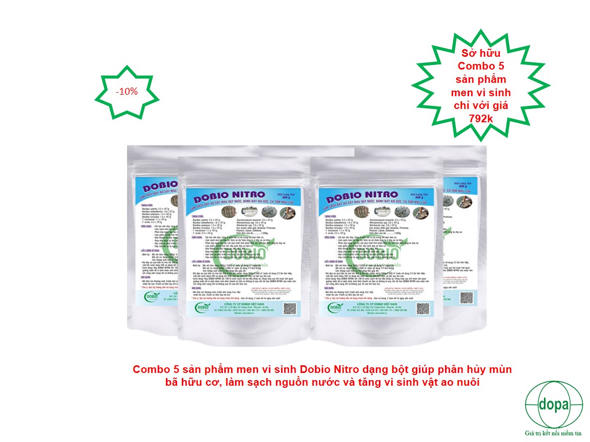Sản phẩm DOBIO NITRO đang được nhiều hộ và chủ trang trại chăn nuôi thủy sản ưa chuộng. là chế phẩm men vi sinh giúp làm sạch đáy ao và hỗ trợ nâng cao chất lượng cho đàn thủy sản. Để hiểu rõ hơn về thông tin, công dụng cũng như cách sử dụng sản phẩm men vi sinh này sao cho hiệu quả, mời bà con tham khảo bài viết sau đây.