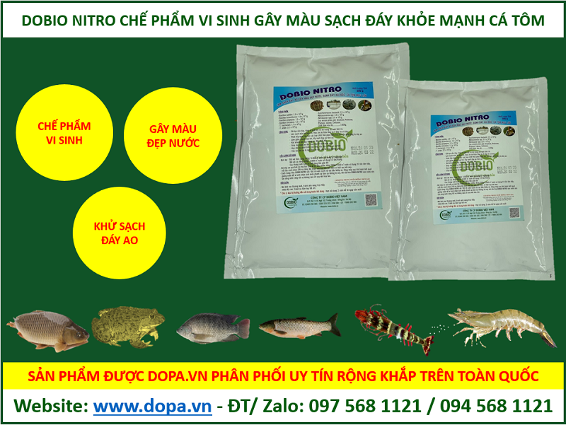 Chế phẩm sinh học men vi sinh khử làm sạch đáy ao nuôi, gây màu nước đẹp DOBIO NITRO LÀM SẠCH ĐÁY AO GÂY MÀU ĐẸP NƯỚC, ĐÁNH BAY KHÍ ĐỘC, CÁ TÔM MAU LỚN. Cải tạo nền đáy, tăng vi sinh vật có lợi trong ao nuôi tôm cá. Phân hủy ngay lập tức các loại chất thải phân tôm, cá, xác tảo chết lắng tụ đáy ao. Giúp cho nước ao lên màu đẹp ổn định màu nước.