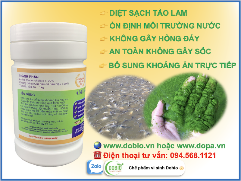 Thì Đồng Hữu Cơ là một giải pháp, một lựa chọn đúng cho bà con. Đồng hữu cơ giải pháp trị diệt cắt tảo lam gây váng xanh, váng vàng trong ao hồ nuôi thuỷ sản cá tôm. Gây ra các hiện tượng nước ao có màu xanh đậm nổi váng xanh váng vàng cá tôm ngạt oxy, kém ăn. Đồng hữu cơ không gây sốc, độc cho tôm cá như việc sử dụng đồng vô cơ để cắt tảo lam. Không làm mất hệ vi sinh có lợi trong ao nuôi. Ổn định màu nước an toàn cho cá. Đồng thời có thể trộn đồng hữu cơ cho thuỷ sản cá tôm ăn trực tiếp để bổ sung khoáng đồng cho cá tôm mà không gây độc cho tôm cá.