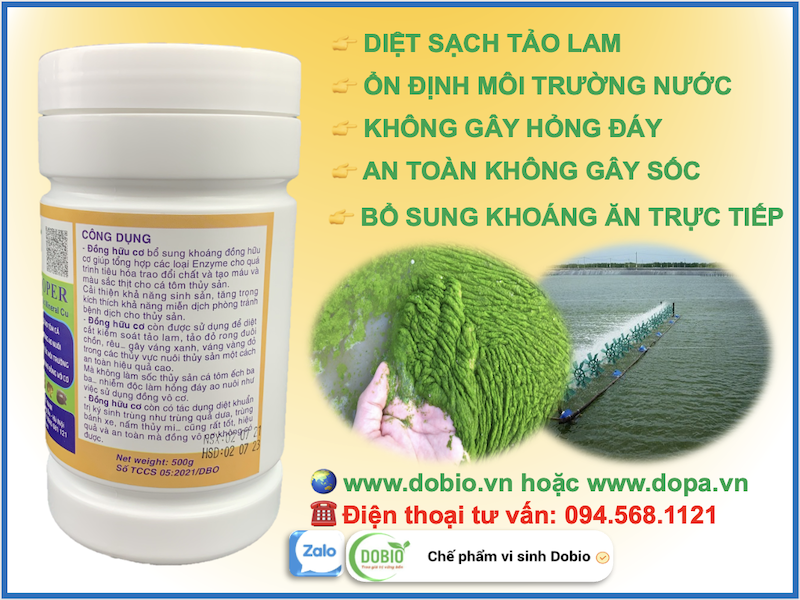 - Đồng hữu cơ còn có tác dụng diệt khuẩn trị ký sinh trùng như trùng quả dưa, trùng bánh xe, nấm thủy mi… cũng rất tốt, hiệu quả và an toàn mà đồng vô cơ không có được. Sau khi dùng sản phẩm Đồng Hữu Cơ bà con nên sử dụng các chế phẩm sinh học men vi sinh như: DOBIO ALGAE, DOBIO NITRO, DOBIO AZ, CHẾ PHẨM EM, DOBIO CLEAN của Dobio.vn được Dopa.vn có địa chỉ websie: www.thuysandopa.vn để cải tạo hệ vi sinh vật có lợi trong ao nuôi và phân huỷ xác tảo chết hiệu quả rất tốt.