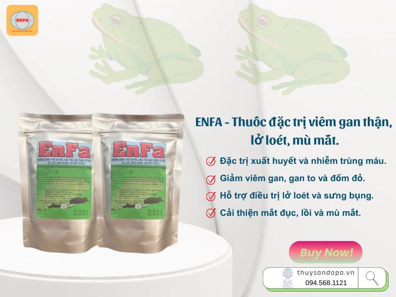 ENFA là sản phẩm chuyên dụng giúp điều trị các bệnh lý nghiêm trọng trên ếch, bao gồm viêm gan thận mủ, lở loét ngoài da, viêm ổ bụng và đục/mù mắt, góp phần bảo vệ sức khỏe và gia tăng năng suất nuôi ếch.