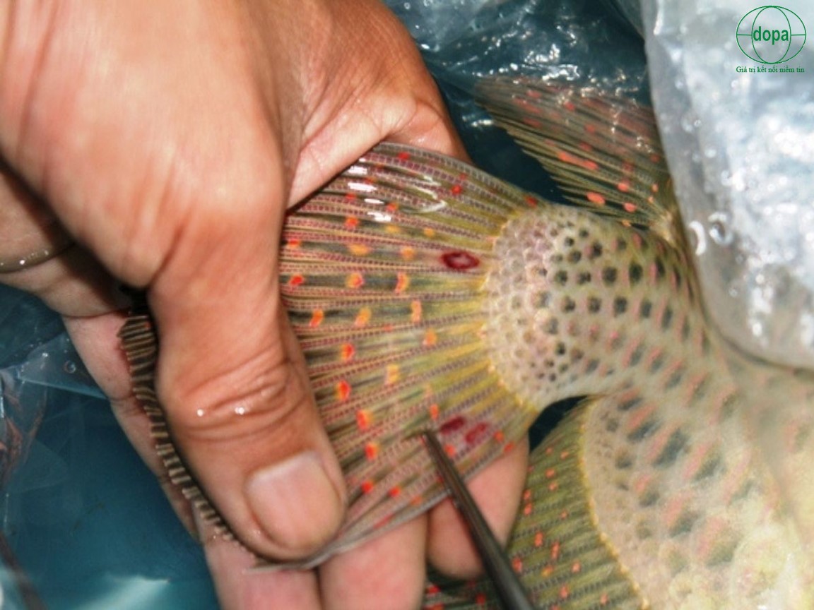 - Bệnh đốm đỏ: Xuất hiện quanh năm, thường tập trung vào cuối mùa xuân, đầu mùa hè (tháng 3 - 5) mùa thu (tháng 8 - 10) khi nhiệt độ nước 25 - 300C. Biểu hiện cá kém ăn hoặc bỏ ăn, bơi lờ đờ trên tầng mặt, da cá tối màu, cá mất nhớt thô ráp, xuất hiện các vết loét ăn sâu vào cơ thể, mắt lồi, hậu môn viêm xuất huyết, bụng có thể chướng to, các vây xơ rách, các vây tia cụt dần, thường gặp ở cá trắm cỏ. Tỷ lệ chết từ 30 - 70%.