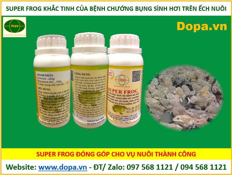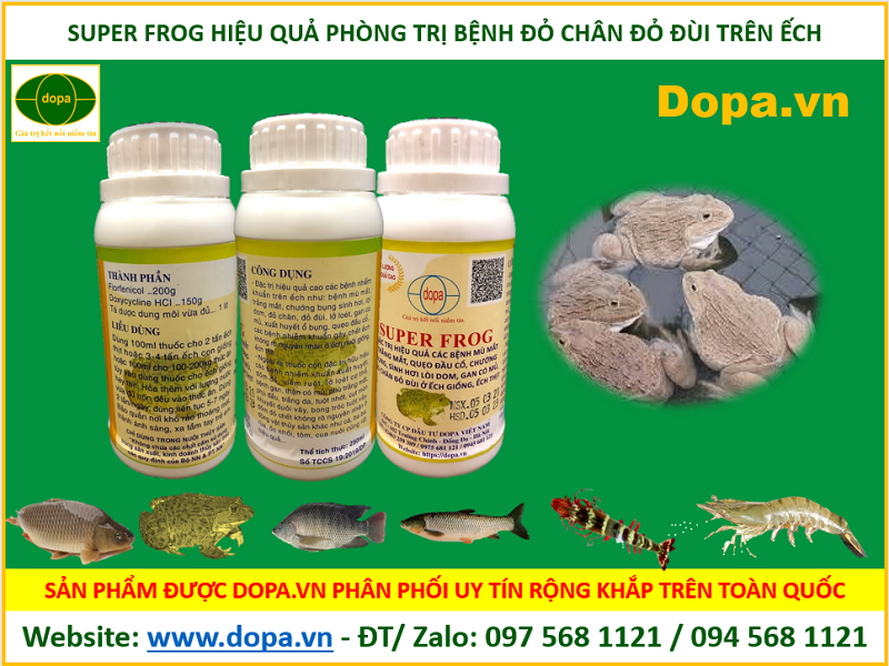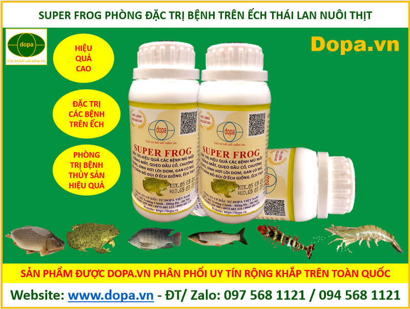 Bà con đang tìm mua địa chỉ công ty đại lý cung cấp bán loại thuốc phòng và đặc trị các bệnh thường gặp trên ếch cá và các loài thủy sản. Đặc trị hiệu quả cao bệnh trên ếch như: bệnh mù mắt, trắng mắt, chướng bụng sình hơi, lòi dom, đỏ chân, đỏ đùi, lở loét, gan có mủ, xuất huyết ổ bụng, quẹo đầu cổ… các bệnh nhiễm khuẩn gây chết ếch không rõ nguyên nhân ở ếch nuôi giống, ếch thịt thì SUPER FROG là thuốc tốt.