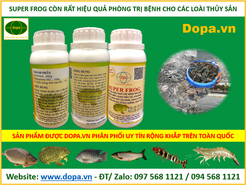 - Ngoài ra thuốc phòng đặc trị hiệu quả tốt với các bệnh nhiễm khuẩn gây ra ở cá, tôm càng xanh, ốc nhồi bưu đen, baba, ốc hương, baba, cua…Bệnh gan, thận có mủ ở cá da trơn, cá có vảy. Đặc trị hiệu quả đối với các bệnh xuất huyết, đốm đỏ, phù trắng mắt, phù đầu, trắng da, tuột nhớt, cụt mòn khuyết đuôi, vây, bong tróc tuột vảy, đốm đỏ, cá chết không rõ nguyên nhân... Bệnh xuất huyết đốm đỏ ở cá trắm cỏ, bệnh lồi mắt trắng mắt ở cá rô phi, cá diêu hồng. Thuốc SUPER FROG phòng trị các bệnh thường gặp ở ếch, cá và các loài thủy sản.